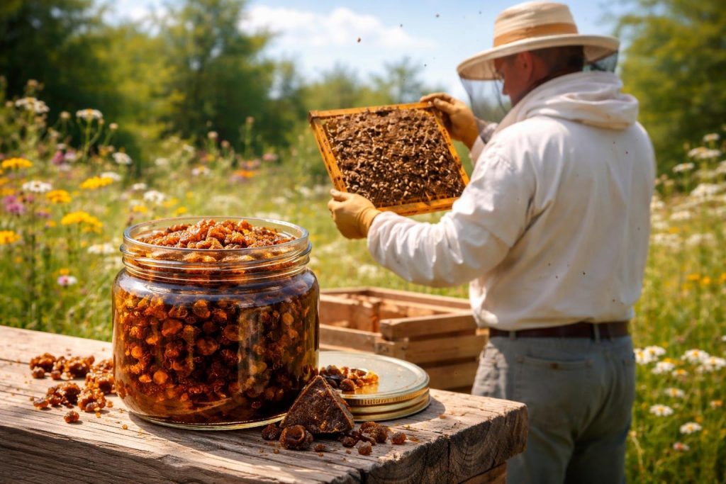 - La propolis brute à mâcher : C’est la forme la plus naturelle. On mâche un petit morceau comme un chewing-gum pour soulager un mal de gorge ou assainir la bouche. Le goût est fort et peut surprendre.